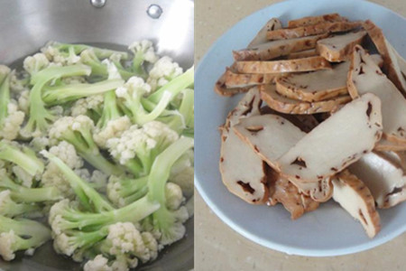 花菜切成小朵,洗净冷水下锅,开大火烧开捞起滤干。酱干洗净切成薄片待用。