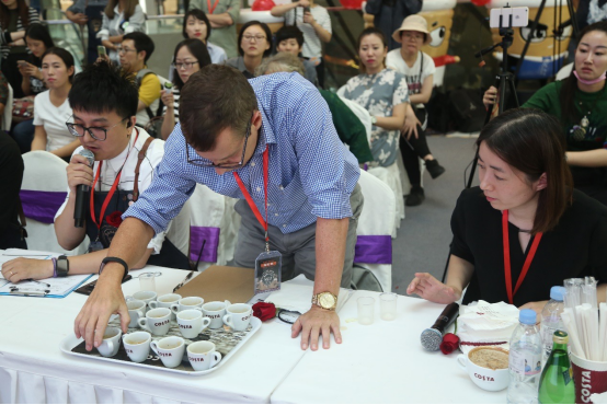硝烟四起的比拼现场,热辣犀利的评审,更是将现场氛围推向高潮。速度赛制作的每杯Espresso(意式浓缩咖啡),都要经过评委“几近苛刻”的检验——咖啡机的组头滤网是否在敲打组头后完全的清洁干净?是否残留多余的咖啡渣?咖啡师在扣上咖啡机接口前是否有使咖啡粉平整?有无夯压的动作? 这次问题都是“挑剔评委”的评分准则。