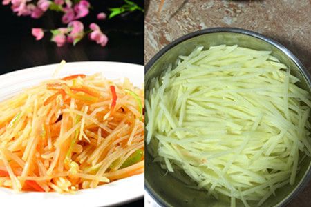 做法:1、将土豆和青椒切成丝,浸泡在水中备用。