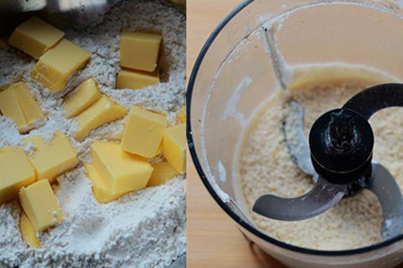面粉装入大盆里,加入少许食盐和60克黄油,混合均匀,注入10克牛奶,揉成柔软度适中的面团,放入冰箱冷藏。将杏仁片放入搅拌机搅碎。