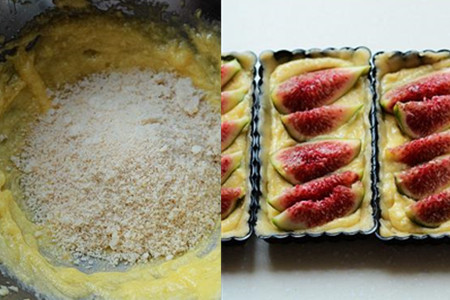 取30克软化的黄油和白砂糖,搅拌均匀,再加入蛋液和杏仁碎搅匀。从冰箱取出面团,用擀面杖擀成面皮,面皮厚度大约为半厘米,再均匀地切割成四份,装入派盘里,用叉子扎些孔,再放入杏仁馅,轻轻压平。无花果洗净切成小块,嵌入派陷中。烤箱调至200度提前预热五分钟,放入派盘,烘烤40分钟左右。