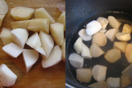 山药削掉外皮,切成滚刀块。煮锅内注入适量清水,放入山药块,开大火烧开后转至小火炖二十分钟。