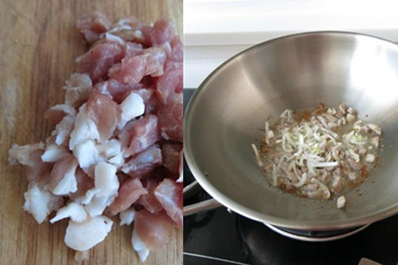瘦肉洗净切成小丁,葱洗净切成丝。炒锅上灶,放入适量油烧热,油热之后,下瘦肉丁煸炒。瘦肉丁炒变色之后,加入葱丝翻炒。