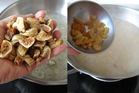 食材:大米30克、糯米30克、燕麦片30克、无花果4个、葡萄干、瘦肉100克、葱花、盐、油。