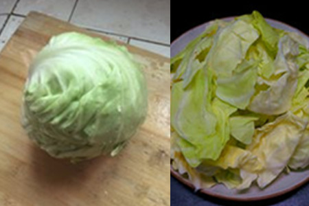 买来的卷心菜用手一点点掰开,检查里面是否有破损的地方。然后用手撕成块状,要单片的,菜叶叠在一起很影响口感。蔬菜撕完后浸泡在水里,准备好一些鲜蘑,清理好之后也要清洗干净,还要准备一些干豆腐,并且要切成一厘米左右宽度的条状。准备好这些食材之后,就可以开始做了,铁锅加热放入食用油,油温升至八层才可以把葱花和干辣椒放进去。