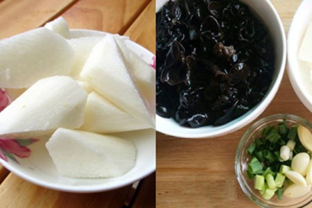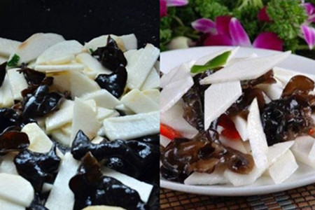 步骤5、再放入山药,翻炒几下,炒到半熟的时候再放人木耳一起翻炒,加入少许的盐和味精,如果觉得有点干,可以加入适量的水稀释一下。