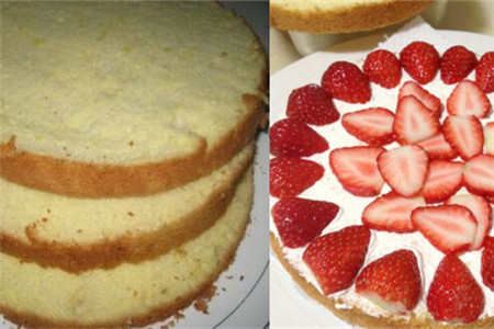 如果想要有一个漂亮的草莓蛋糕,我们就可以将它做出许多的形状,同样是将之前的蛋糕烤好之后,将蛋糕切成不同大小的圆形,比较大的一块蛋糕放在底下,在上面抹一点奶油,抹在上面的奶油可以不用加草莓汁,因为我们要将草莓放在蛋糕里面。