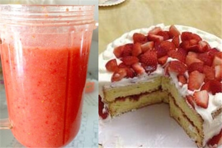 在烤蛋糕的时候我们就可以同时去做另外一个步骤了,这样也比较的节约时间,因为蛋糕也需要一定的时间才能够烤好。因为今天我们要做的是草莓口味的蛋糕,所以我们肯定要准备很多的草莓。先把草莓洗干净之后打成果汁,然后倒在刚才的奶油里面。