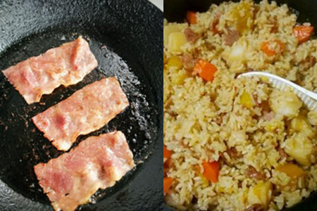 1、准备的食材有培根、南瓜、土豆、胡萝卜、米饭。