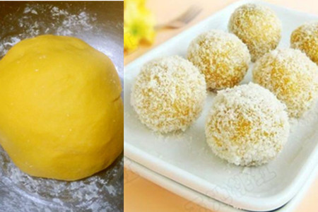 6、把椰蓉倒在一个盘子中,把蒸好的南瓜球放在上面滚在一圈,使南瓜球均匀地裹上一层椰蓉便可食用。