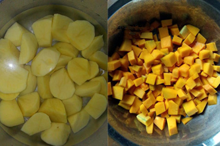 2、先将山药和南瓜削去外皮,洗净后用刀切成滚刀块。