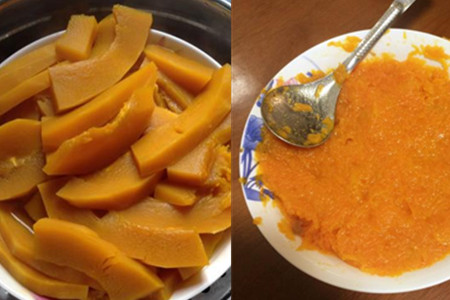 4、把蒸熟的南瓜从锅中取出,用勺子将南瓜块压烂成泥。趁热往南瓜泥之中倒入适量的糯米粉,一定要趁热,因为南瓜泥的热量能将糯米粉弄熟。