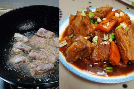 5、在炒锅之中下入些许的食用油,油温烧热后。把排骨下入油锅中,小火炸至表面金黄后。捞出控干上面的油分。利用锅中的余油,把葱姜、洗净的八角小火进行爆香。待其香味散发后,往锅中逐一加入炸好的排骨、山药、南瓜块。