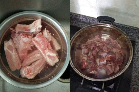 4、在煮锅之中倒入足量的清水,水沸腾后把排骨倒入其中焯一遍水。把焯好的水的排骨用漏勺捞出,控干多余的水分。