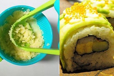 牛油果饭团,在制作前先将糯米饭煮好以备用。首先用蛋黄液烙一张蛋卷,铺在寿司卷帘上。然后,把熟牛油果打成泥,和糯米饭一起搅拌均匀,平铺在蛋卷上。接着,把生牛油果、青瓜、胡萝卜切块,用开水烫两三分钟,取出放在糯米饭上,再铺上一层肉松。把寿司卷帘卷紧,取出切块,淋上鱼子酱,美味就完成了。