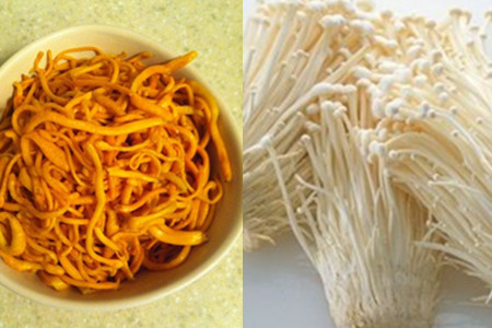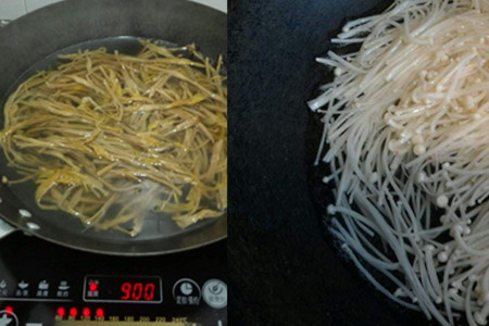 金针菇也是一种抗癌食物,所以两者结合必能吃出健康。金针菇和黄花菜都需要事先用开水过一遍,黄花菜特别容易蔫吧,所以买来后抓紧时间制做为宜。金针菇用刀切掉尾部的脏东西,然后放进水里,用手掰开仔细清洗,黄花菜仅仅需要简单冲洗就足够了。两种食材准备好之后,烧一锅开水,等到水开始冒泡,既可以把蔬菜放进去了,先放金针菇后放黄花菜。
