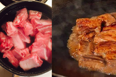 这种东西碰到皮肤容易引起过敏,所以要隔离开。排骨需要切成小块,既美观做起来也容易熟,而且事先要过一遍水,可以去除排骨里的血沫子。煮开一次就可以拿出来沥干水分,然后把剥好的芋头切成块状,放在清水里,因为芋头很快会被氧化,颜色也会变黑,所以要隔离氧气。炒锅加热然后倒入食用油,油热后放入葱花,倒入商量的生抽,再把排骨放进去。