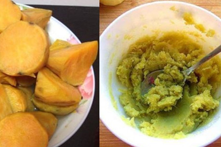 步骤3、用勺子或者是小铲子把它压碎,搅拌均匀,让白糖和面粉可以充分的融入到地瓜中。