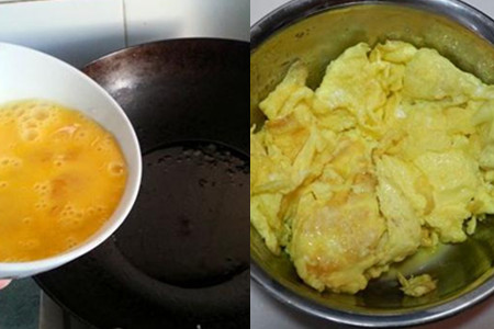 两面都煎好以后,用锅铲将鸡蛋饼斩成小块,并翻炒一下出锅。鸡蛋在炒的时候要注意火不要太大,大火容易将鸡蛋煎糊,煎糊了的鸡蛋可就不是很好吃了。