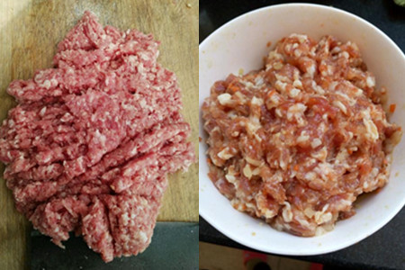 3、把新鲜的瘦肉洗净表面的血水,控干多余的水分。把它放在砧板之中,用刀剁成碎末状。在一个碗中打入几个鸡蛋,用蛋清分离器取出蛋黄,仅仅只留下蛋清。往肉泥之中逐一加入葱花、生姜末、盐、白砂糖、香油、蛋清用筷子进行均匀地搅拌,搅拌的时候要顺着一个方位来进行。