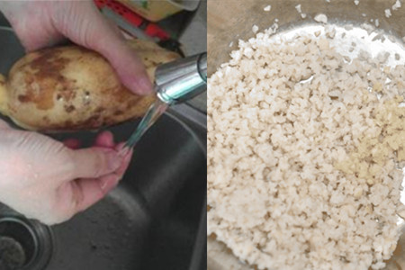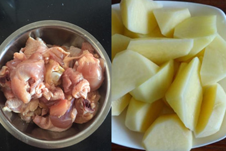 3、把土豆削去外皮,放在水龙头下冲洗一遍。把土豆切成滚刀块,置于一遍备用。