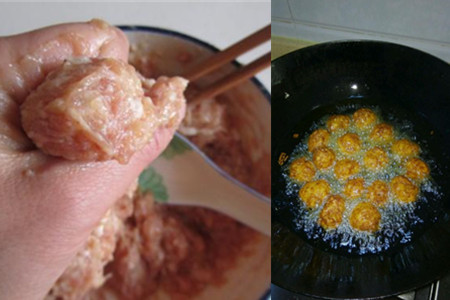 5、在锅中下入足量的食用油,油温上升到五六成时。把丸子下入油锅之中,中火漫漫炸至其呈现金黄的色泽,便可用漏勺捞出,控干多余的油分待用。