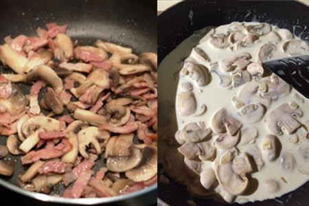 4、将些许的食用油倒入洗净的炒锅中,油温烧到七八成时。往油锅中倒入蘑菇片和培根进行翻炒,撒上些盐,倒入适当的牛奶。牛奶的量一定要没过食材,这时候再往里加入些淡奶油。