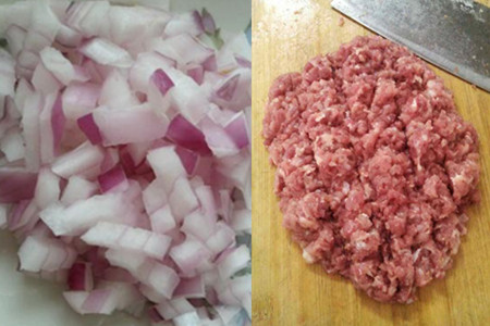 4、洋葱剥去外面的表皮,洗净后切成碎末状。切洋葱的时候,它的气味会刺激我们的眼睛。可以在切洋葱的时候,把洋葱事先冷藏十分钟左右再取出继续切。或者将洋葱切去头尾两个部位,切成对半后浸泡在清水中,时间只需要十多分钟。