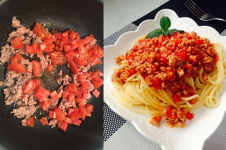 6、这时候把番茄丁加入锅中,番茄煮出水分后。这时候再往里逐一加入些许的番茄酱、盐、白砂糖进行充分地翻炒。大火烧开汤汁后,再改为小火慢慢熬煮至汤汁收浓便可关火。