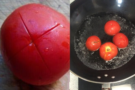 2、先将去除番茄的根蒂,洗净后用刀在上面划上一个十字架。在煮锅之中下入足量的清水,水烧开沸腾后,把番茄放入煮锅中煮上几分钟。番茄煮好后,把番茄皮剥去,用刀切小丁状。蒜剥皮,切成碎末状。