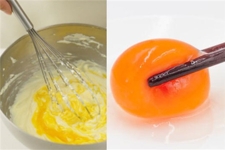 把奶油打好之后就放入刚才的蛋黄液里面,同样是将它们搅拌均匀。如果想要自己的芝士蛋糕做出不同的形状,我们可以将蛋黄液倒在不同形状的模具里面,但是在倒蛋黄液之前,我们一定要在模具上面抹一点黄油,不然烤出来的蛋糕很容易粘锅。