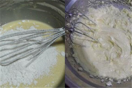为了让蛋黄和芝士搅拌的更加均匀,我们也可以先只放一个蛋黄进去搅拌,等待第一个蛋黄搅拌均匀之后再接着放第二个。等所有的蛋黄和奶油都搅拌均匀之后就倒入面粉,不管是做什么蛋糕,我们倒入的面粉肯定都是低筋面粉,不要用平时我们煮面食的面粉。