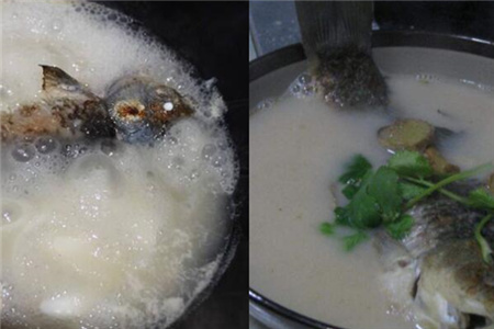 等鱼煎好以后,准备一口汤锅,加入适量的清水,将鲫鱼放入锅中。加入葱姜、鸡粉等调味品,先开大火将汤煮沸,然后转成中火慢慢熬制。等上15分钟左右,鱼汤就会变成奶白色了,这个时候就可以关火收工啦。