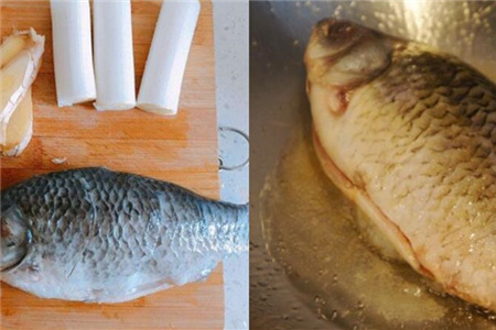 先把鲫鱼用料酒和盐腌制10分钟,之后用不粘锅加热色拉油。然后把鲫鱼放入油锅中煎炸,煎炸过程中火不能太大不然容易焦。等鱼皮变成金黄色的时候将鲫鱼翻个个儿,将另外一面的鱼皮也煎至金黄色。这个步骤就是等一下鲫鱼汤能不能变成白色的关键所在,所以煎鱼的时候一定要把鱼皮煎透了。
