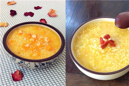 二、南瓜胡萝卜小米粥将南瓜胡萝卜都切成小块,同样与炒制过的小米煮至粘稠,一碗粥,又五谷杂粮又有蔬菜,营养全面,非常适合小孩使用哦。