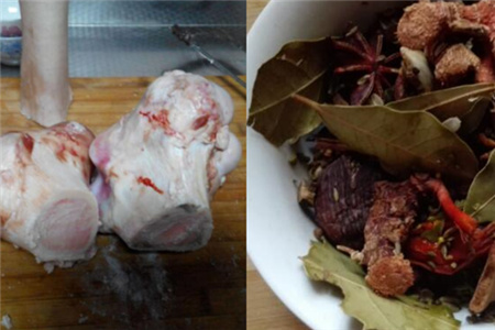 材料:牛骨1根(500克以上),牛肉100克,大葱1根、生姜3片、八角2个、大料1个、香叶3片、草果1个、小茴香10粒、花椒10粒、白胡椒10粒、良姜1片、肉蔻1个、筚拨1个、砂仁少许、陈皮2片、山奈1个。