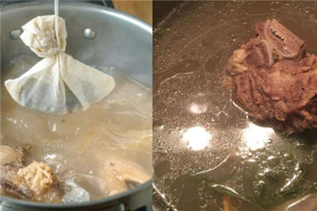 盖上锅盖开,将灶火转成极小状态。慢慢的闷煮上两个钟头,这时候牛肉应该酥烂了,可以将牛肉捞出(可以作为卤牛肉的原料)。盖上锅盖继续闷煮两个小时,这时候就可以将牛骨和香料包取出了。