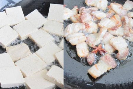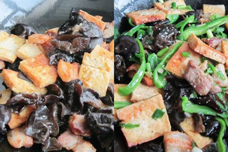 豆腐切成薄块,五花肉洗净切成薄片,木耳洗净,生姜切成末,青辣椒切成细丝,香葱洗净切成末。炒锅内倒入适量油烧热,放入豆腐煎一下,煎成双面焦黄后捞起待用。将切好的肉片下锅煸炒,加几粒八角,肉片煸成金黄色后,烹入适量料酒,加入姜末,炒匀炒香。