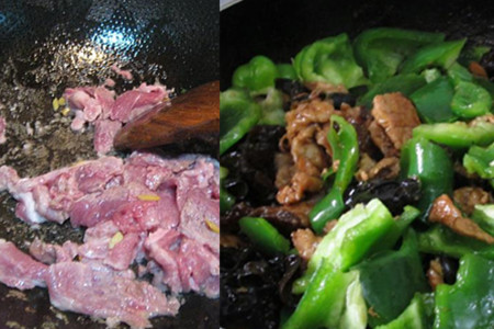 炒锅上灶,放入适量油烧热,油热之后,下瘦肉片煸炒。肉片煸炒至变色后,加入葱段和姜片,烹入适量料酒、酱油和白砂糖,炒匀。接着将木耳和青椒块下锅,快速炒开,青椒断生后调入适量食盐和鸡精即可。木耳需要提前泡发。青椒块下锅后要大火快炒,这样青椒才会脆甜。