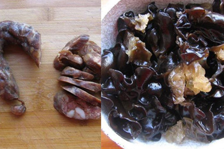 腊肠洗净切成片状。木耳放入温水里泡发,清洗干净,撕成小块。青蒜洗净斜切成段。