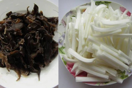 食材:木耳300克、腊肠60克、青蒜40克、芝麻油、鸡汁、胡萝卜、盐、油。