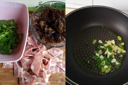 培根切成薄片,青椒洗净切成丝,木耳洗净撕成小块。炒锅上灶,倒入适量油烧热,下葱姜煸炒。