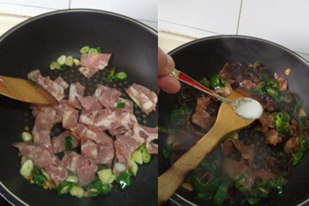 煸出香味之后,将培根片下锅翻炒,烹入适量料酒、生抽和白砂糖,炒匀。接着加入青椒丝和木耳块,继续翻炒。炒熟之后,调入适量食盐,炒匀即可熄火。木耳前一晚上用清水泡发,可在水中加少许食盐,这样清洗得更干净。这道菜全程都要大火快炒,青椒下锅炒熟即可熄火。
