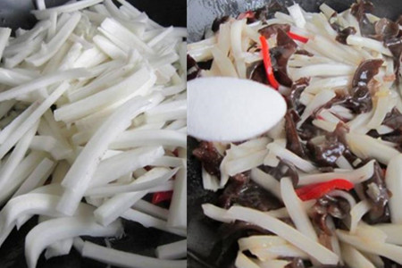 炒锅内放入适量油烧热,油热之后,下姜末和辣椒丝煸炒。煸出辣味之后,下白菜梗丝,调入适量白砂糖,炒匀。接着将木耳丝下锅,烹入适量香醋,调入适量食盐,翻炒几下,再淋入适量生抽炒匀即可。白菜梗调入适量白砂糖可以变得更脆,不过要先加盐再加白砂糖,因为白菜梗会炒出很多水分。