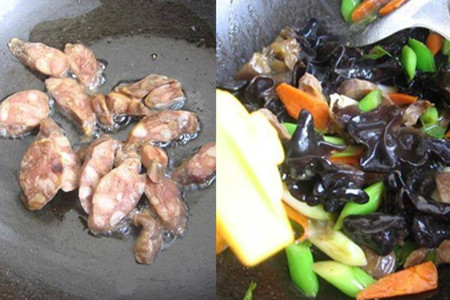 炒锅中放入适量油,油热之后,下腊肠片煸炒。腊肠片炒出油脂之后,下青蒜段和胡萝卜片一起煸炒。胡萝卜片炒至略微变软时,将木耳块下锅,调入适量食盐炒匀即可关火,关火之后,淋入适量芝麻油,滴入几滴鸡汁,炒匀即可。清洗木耳时加少许食盐搓洗,这样更容易洗干净。