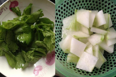 食材:小海蟹400克、冬瓜400克、瘦肉50克、芹菜、胡椒粉、番薯粉、油、盐。