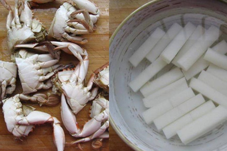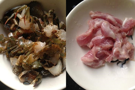 海蟹刷洗干净,对半切开,去掉腮部。瘦肉洗净切成大小合适的片状,加适量番薯粉、油和食盐,拌匀腌制片刻。