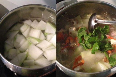 汤锅上灶,放入冬瓜块,注入适量清水,开大火煮沸。煮沸之后,将处理好的海蟹下锅煮五分钟。五分钟之后,加入腌好的瘦肉片,煮熟即可熄火。熄火后,调入适量食盐和胡椒粉,加入芹菜段即可盛出锅。瘦肉可以放也可以不放,放瘦肉主要是提升汤汁的鲜甜度。