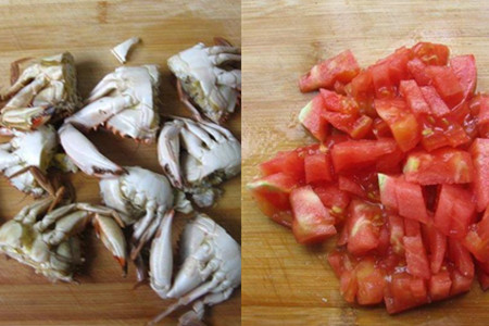 海蟹刷洗干净,对半切开。年糕切成小段,放入清水里泡一下。西红柿剥掉外皮,切成小丁。
