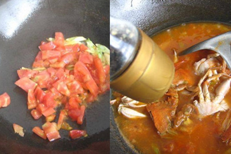 炒锅上灶,放入少许油烧热,放入切好的姜丝和葱段煸炒。炒出香味之后,将西红柿块下锅翻炒,把西红柿块炒成糊状。接着注入适量清水,放入处理好的海蟹,调至大火烧开。烧开之后,取一大勺番茄酱下锅,再次烧开,尝一下味道后调入适量食盐和高汤精即可关火。出锅前加入黑胡椒粉和香菜碎。海蟹下锅煮熟后再加清水。